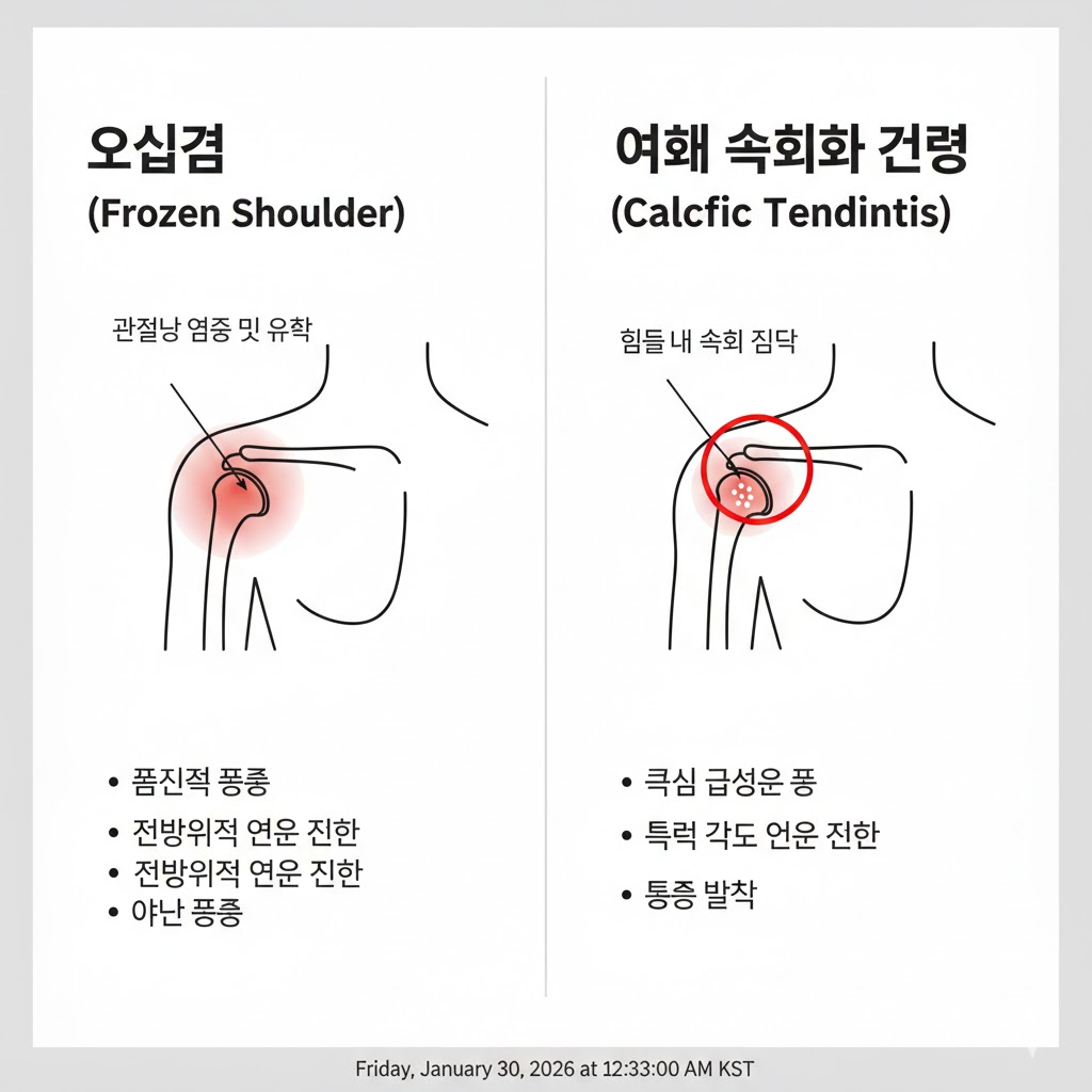 - 오십견과의 차이: 오십견(유착성 관절낭염)은 어깨 관절 전체가 굳어 모든 방향의 움직임이 제한되지만, 석회화 건염은 특정 각도에서 날카로운 통증이 발생하며 팔을 들어 올릴 때 '걸리는 느낌'이 강한 것이 특징입니다.