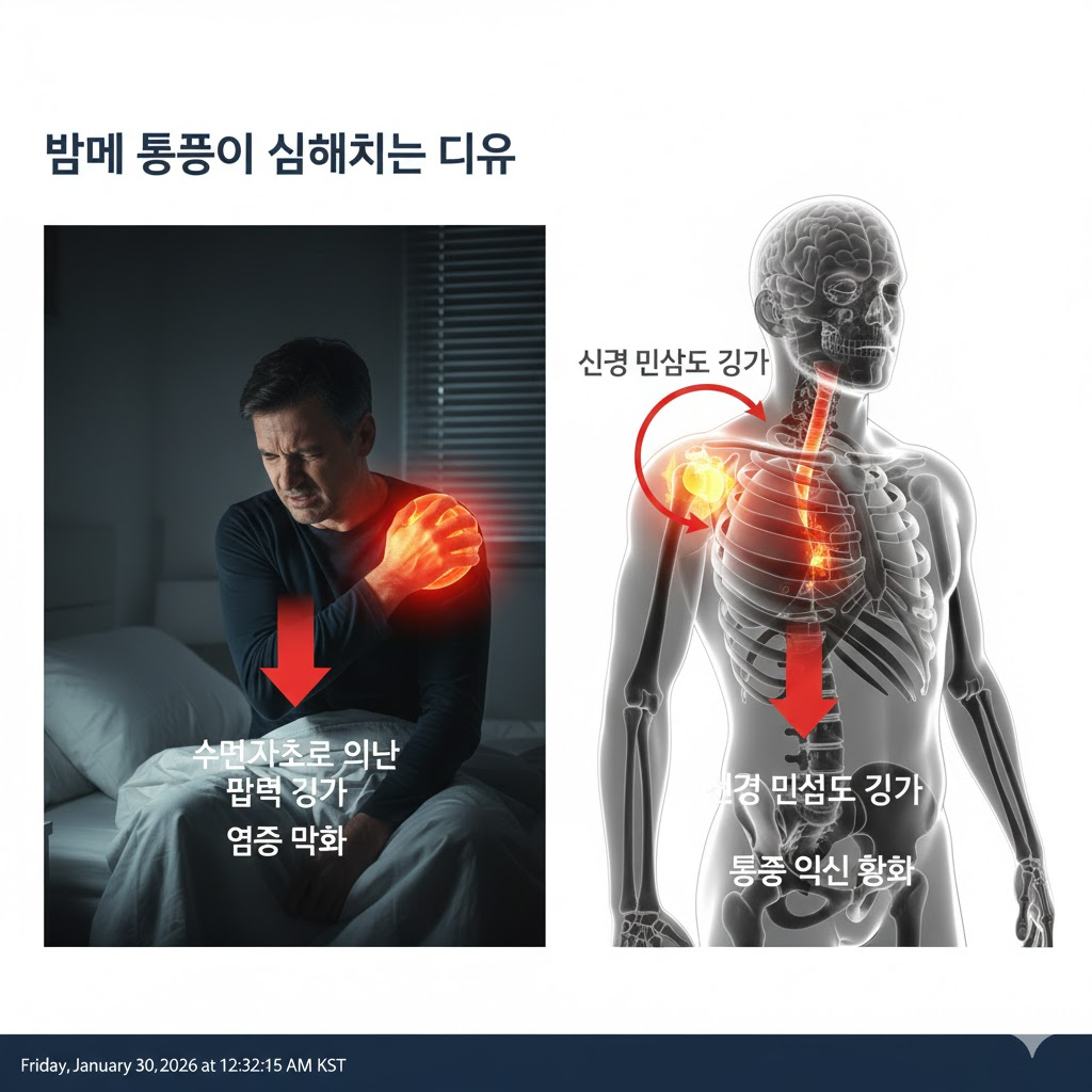 - 혈류 변화: 밤에 누워 있으면 어깨 쪽으로 혈류가 집중되고, 염증 반응이 더 활발해지면서 통증이 증폭됩니다.