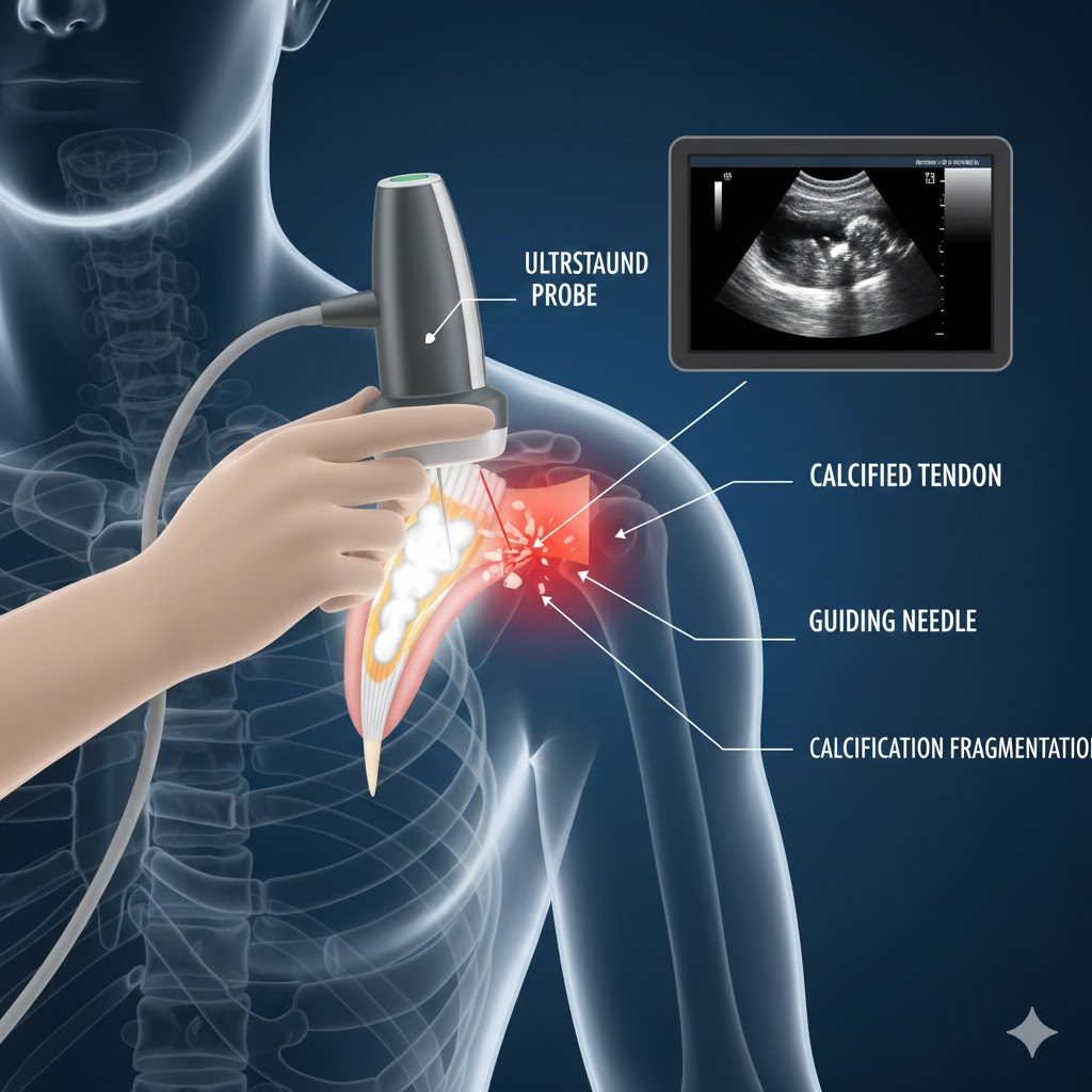 초음파로 석회의 위치를 실시간으로 확인하면서 가느다란 주삿바늘로 석회를 잘게 깨뜨리거나, 생리식염수를 주입해 석회를 뽑아내는 시술입니다. 체외충격파만으로 해결되지 않는 크고 단단한 석회에 효과적입니다.